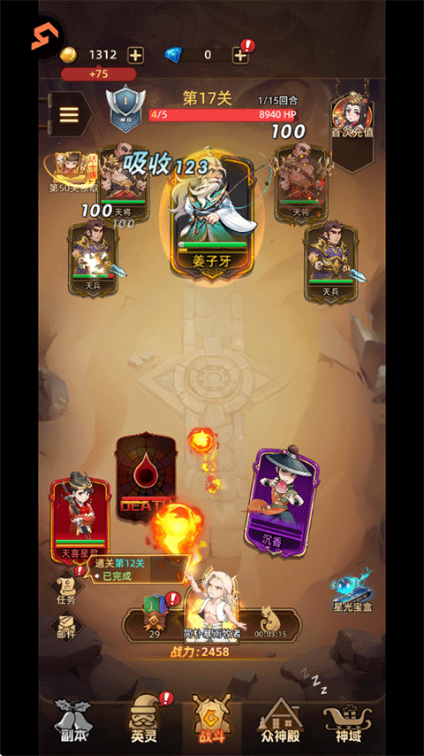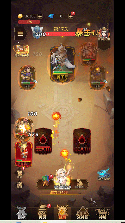 拒绝数值碾压,玩家需通过英灵站位、技能释放顺序和属性克制制定战术。例如,面对高爆发阵容可前排放置天喜星君(群体控制)和红鸾星君(吸血续航),后排搭配宙斯(后排暴击)和齐天大圣(灼烧引爆)。