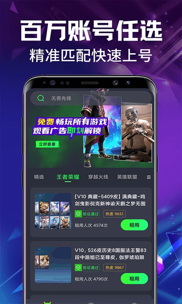 免费租号玩是一个专业的游戏账号租赁平台,为广大游戏爱好者提供安全、便捷的账号租赁服务。平台提供的游戏账号涵盖了王者荣耀、和平精英、火影忍者手游、CF手游、英雄联盟LOL等多款热门游戏。通过简单的操作,一键租赁心仪的账号。